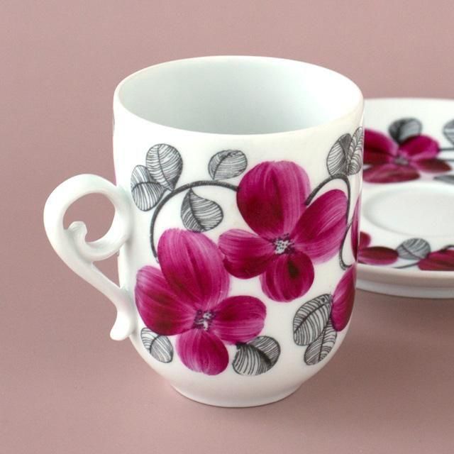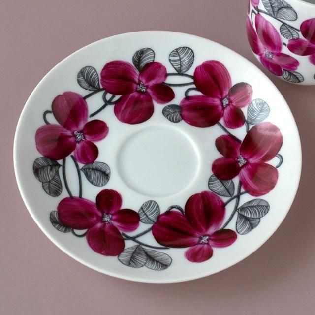 転写プリントによる繊細な濃いグレーの線描で花の茎と葉を描き、その上からハンドペイントで赤紫の花びらを彩色しています。機械的ではなく、一筆ごとに職人の手の動きが感じられる、柔らかい表情が魅力です。