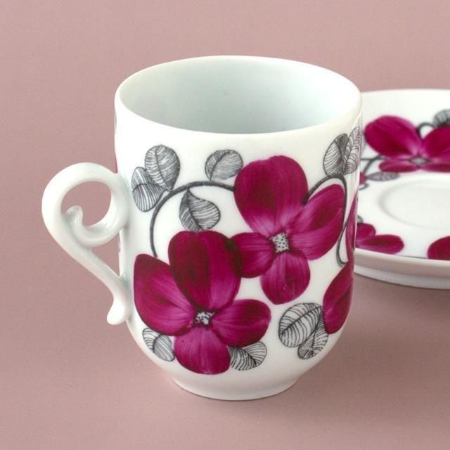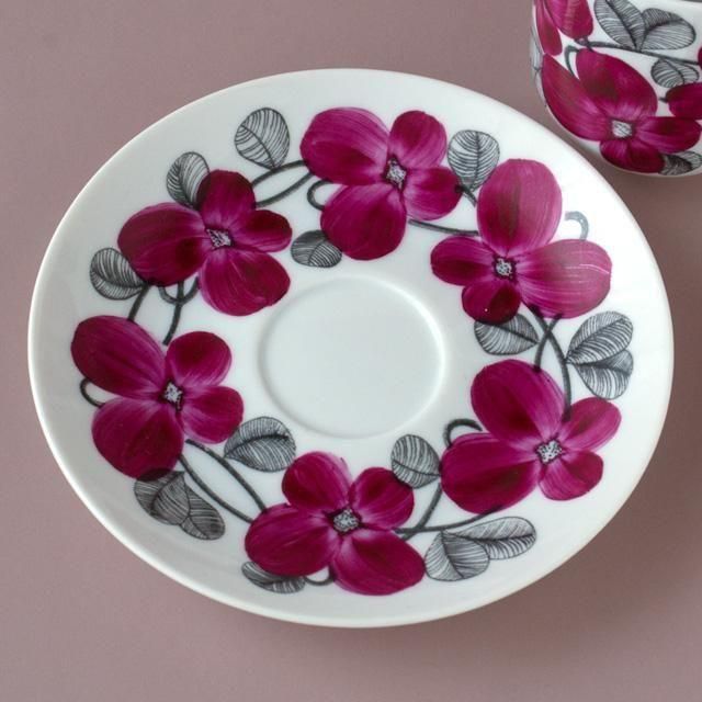 転写プリントによる繊細な濃いグレーの線描で花の茎と葉を描き、その上からハンドペイントで赤紫の花びらを彩色しています。機械的ではなく、一筆ごとに職人の手の動きが感じられる、柔らかい表情が魅力です。