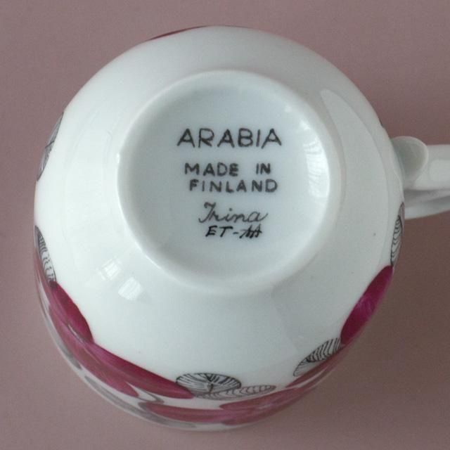 前半の「ET」はデコレーションデザイナー Esteri Tomula のイニシャルを、後半は絵付師(ペインター)の個人サインを示すと考えられています。どちらのマークも、当時の手描き生産によるわずかな個体差を物語ります。