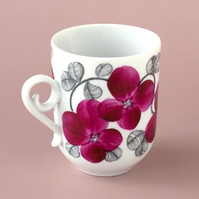 転写プリントによる繊細な濃いグレーの線描で花の茎と葉を描き、その上からハンドペイントで赤紫の花びらを彩色しています。機械的ではなく、一筆ごとに職人の手の動きが感じられる、柔らかい表情が魅力です。