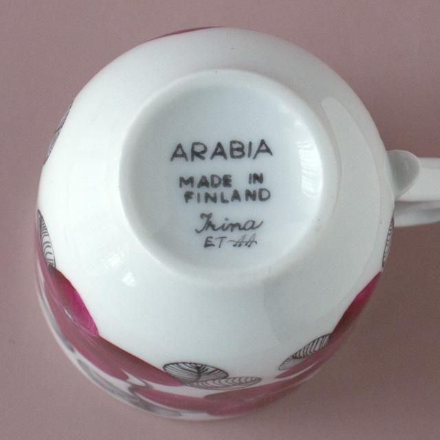 前半の「ET」はデコレーションデザイナー Esteri Tomula のイニシャルを、後半は絵付師(ペインター)の個人サインを示すと考えられています。どちらのマークも、当時の手描き生産によるわずかな個体差を物語ります。